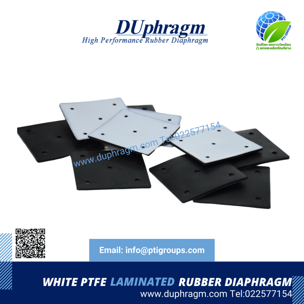 DuPhragm บริการรับผลิตแผ่นยางไดอะแฟรมเคลือบเทปล่อน. สำหรับการใช้งานที่รองรับการทนแรงดันและทนสารเคมีเข้มข้นสูง แผ่นยางไดอะแฟรมเคลือบเทปล่อนที่มีบริการรับผลิตมีทั้งแผ่นยางไดอะแฟรมแบบยางล้วน และแผ่นยางไดอะแฟรมเสริมผ้าใบ พร้อมบริการตัดตามแบบ พร้อมให้คุณนำไปประกอบใช้งานได้ทันที ความหนาเริ่มต้น 1 mm